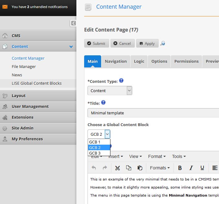 Then I created a new Content Page and set it up to use this 'Global Settings' page template, hide this page from the menu. Alias for this page is 'gs'. I gave the page a title/menu text which makes sense for editors: 'Global Content' (note the page isn't shown on frontpage but menu text is shown in Content Manager).