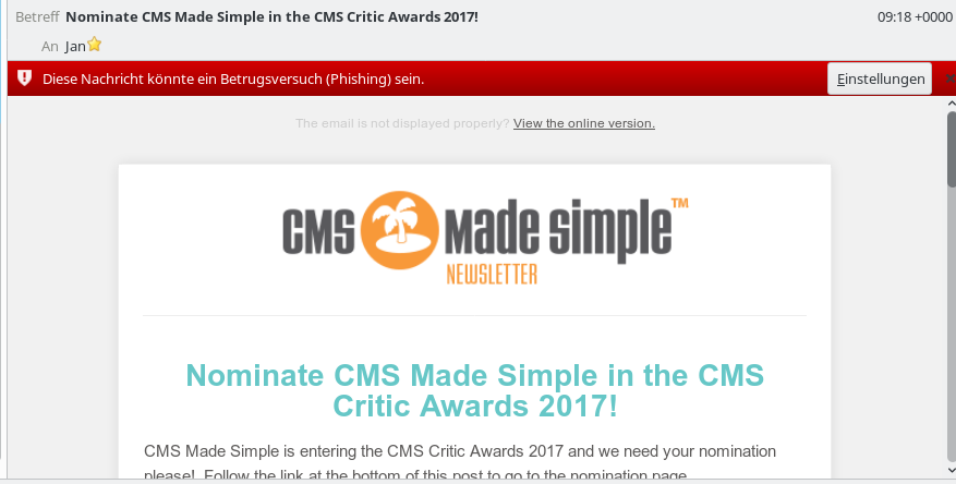 I get a notification from my mailclient (Thunderbird) that the newsletter probably is a phishing mail.