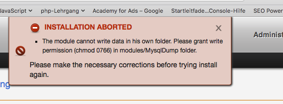 For some time now I was not able to install MysqlDump to new installations of CMSms. The file seemed to install but in the module manager I always got a red failure notice: I tried to change the permissions even to 777 or tried to install the folder manually. Nothing helped.