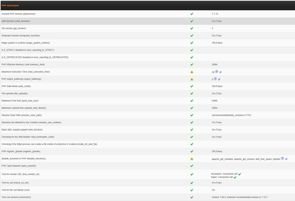 I've attached a screenshot of the PHP info. I noticed some 'Caution' symbols in there - not sure if those are indicating the issue...