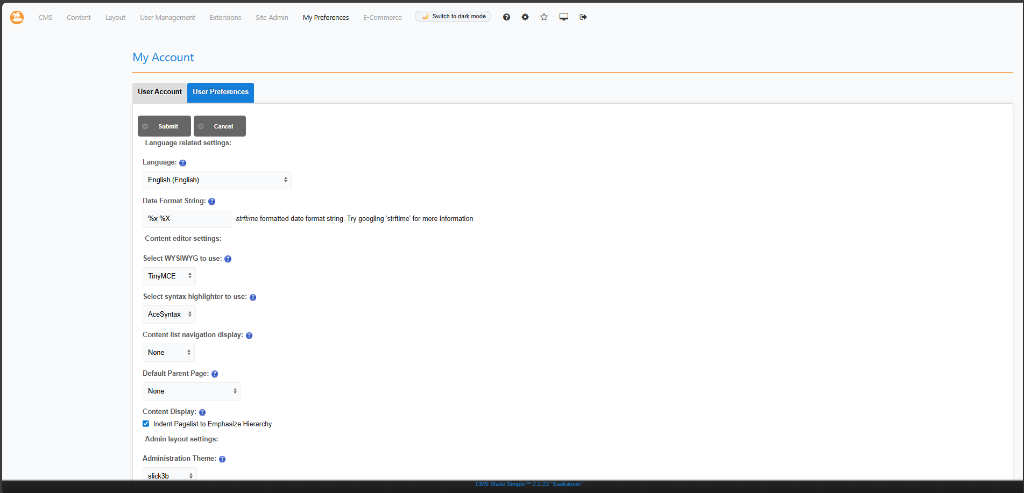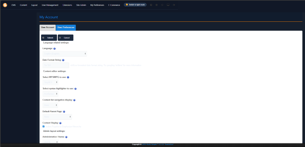 Hi Has anyone done a Dark theme for the Admin panel for the CMSMS 2.x? Its posbile for send me a copy of it please. I do find it really hard to use with a light theme as I have dyslexia and having a dark backgrounds and light text helps me. I have start editing the CSS for the OneEleven and realised there is a lot of colors need changing and working out which part of CSS is for.