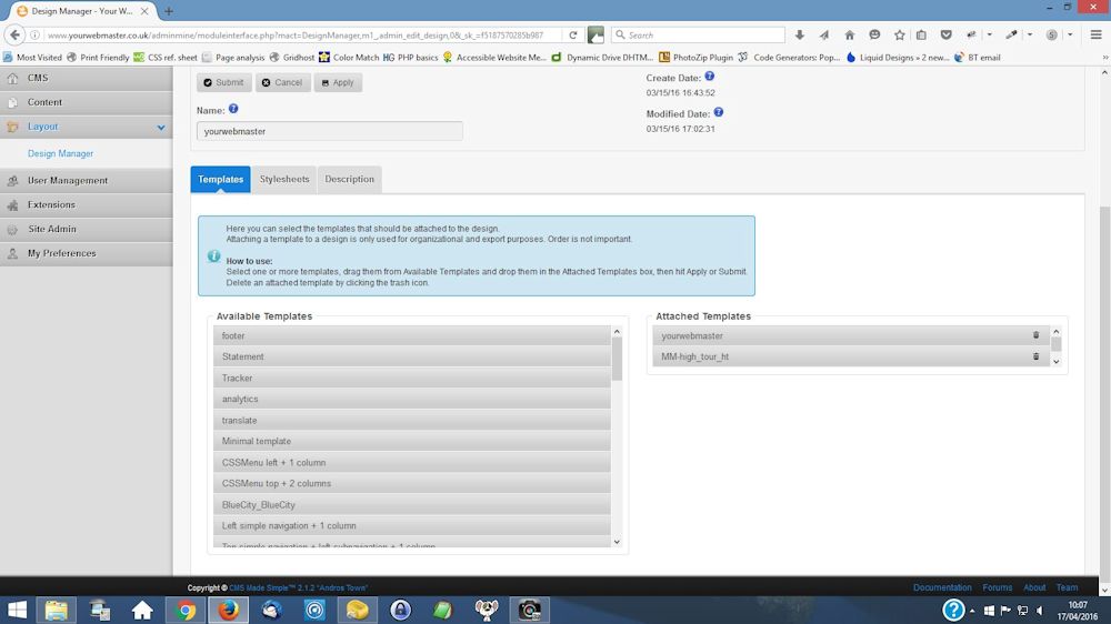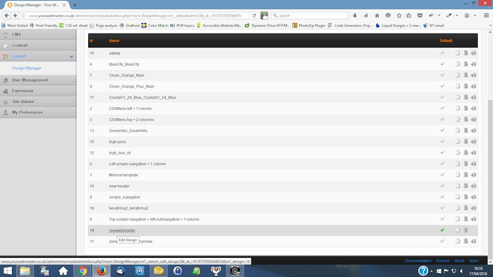 Essentially, the editing system is confusing. Looking at the list of templates at the one with a tick indicating it is the one being use, there is a small box to the r/h side. The tooltip stated 'edit design'. If you click it you get to the screen with the listing of available and attached templates-see previous posting. Nowhere on that page is there a link to editing. HOWEVER, if you click 'submit', which presumably should only apply to finalising the attachment/detachment of templates, you come to another 'design manager' screen. Clicking on Templates you get another list AND in that list is the template again (as core page), and on the right hand site is a box with the tooltip 'edit'. Click on that and you get the template code that can be edited.