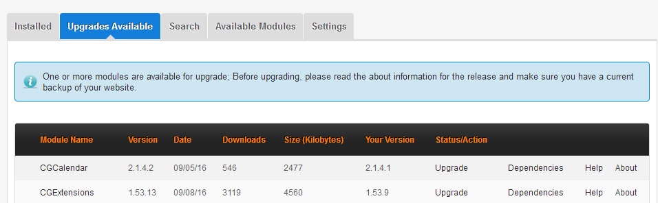 In Module Manager the "Upgrades Available" tab appears when one or more modules have newer versions in the forge ready for upgrading: