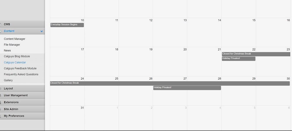 I've attached an image that shows an example. The multi-day "Holiday Privates!" is scheduled all day from 27-29, but only shows up on the calendar 27-28.