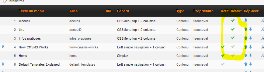 Screen capture of content management showing 3 pages with the Default checkmark, and no active checkmark