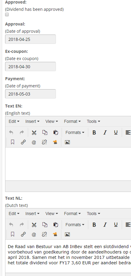 Dividend has 3 relevant dates (in my case): date of approval, date of ex-coupon and date of payment. I also want to show those dates/events in the website's agenda which holds other (non-dividend) events too (agenda items 'live' in another LISE instance, remember). So when I save a new (or edited) dividend item I use a UDT (User Defined Tag) connected to the PostItemSave event to automatically generate the three agenda items (obviously the dates need to be filled in the dividend item). The agenda item properties will automatically be populated: the date, the type of event (payment,approval or ex-coupon), the company etc.