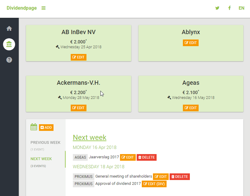 Another plugin creates urls to specific admin actions of modules. Have a look at the screen shot below. Those red and orange buttons are only available when I'm logged in in the CMSMS admin backend too. The links will bring me immediately to the specific item to edit it (or add or delete). It even 'knows' when a agenda item is automatically created (as explained before) by creating a dividend item so in that case it will bring me to the dividend item to change it there (for consistency reasons).