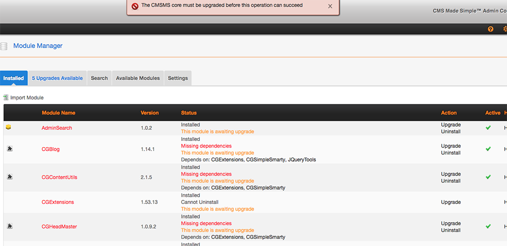 FYI, They are ALL CG Modules apart from Gallery, but they all give the same error message when I try and upgrade