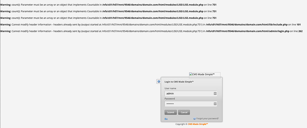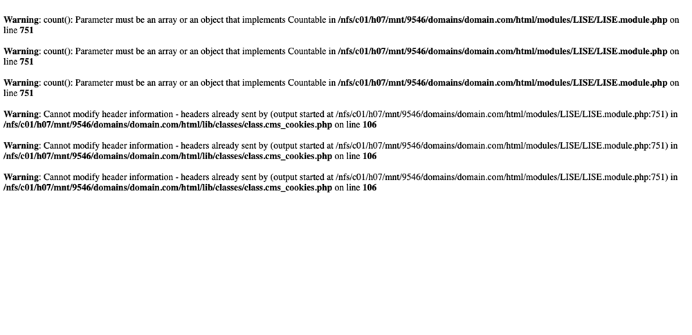 Warning: Cannot modify header information - headers already sent by (output started at /nfs/c01/h07/mnt/9546/domains/domain.com/html/modules/LISE/LISE.module.php:751) in /nfs/c01/h07/mnt/9546/domains/domain.com/html/lib/classes/class.cms_cookies.php on line 106